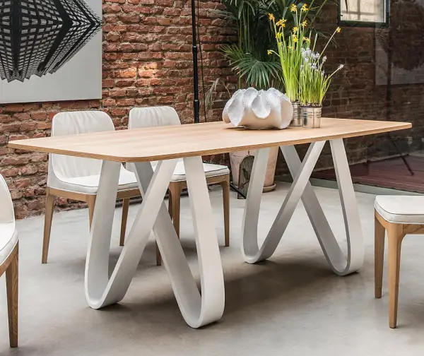 Esta mesa está fabricada con un sobre en cristal, cerámica o gres porcelánico patas en madera curvada.