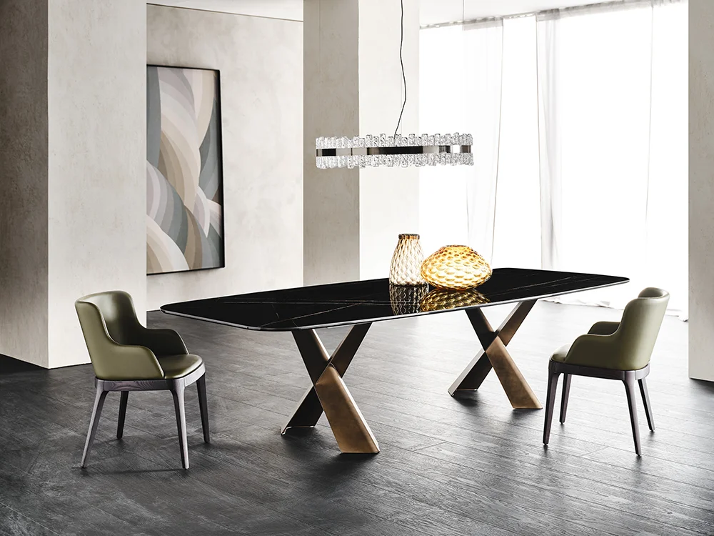 Mesa con base en acero barnizado gofrado en colores titanio (GFM11), bronce (GFM18), graphite (GFM69) o negro (GFM73), disponible también en acabados Brushed Bronze o Brushed Grey. El sobre está disponible en cerámica Marmi en una amplia gama de colores: Alabastro (KM02), Supreme (KM03), Golden Calacatta mate (KM05), Golden Calacatta brillo (KM06), Portoro mate (KM07), Portoro brillo (KM08), Sahara Noir brillo (KM09), Makalu (KM11), Breccia (KM12), Arenal (KM13), Corcovado (KM14), Kaindy (KM16), Borghini Calacatta mate (KM18), Borghini Calacatta brillo (KM19), Colosseo (KM21), Andromeda (KM22), Invisible mate (KM24) y Luxor (KS23). Las variaciones cromáticas y de cepillado en el acabado Brushed son características de la producción artesanal y no deben considerarse defectos.