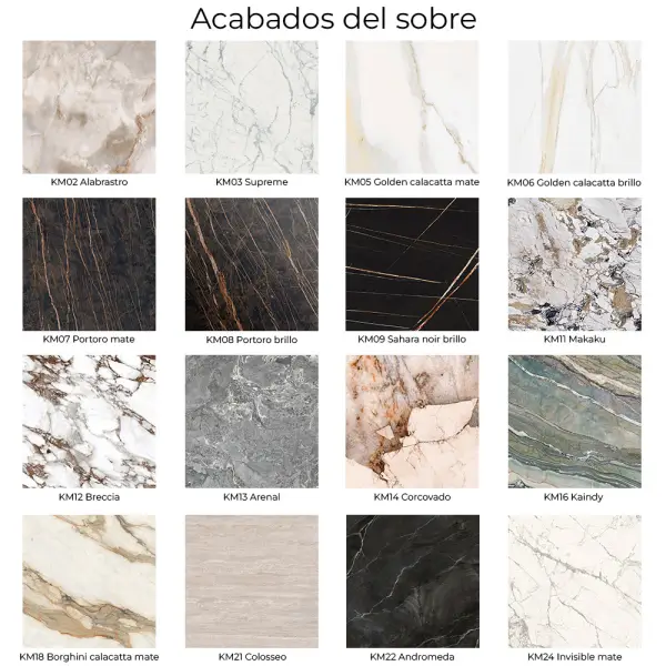 Esta mesa de diseño de alta gama cuenta con una base en acero barnizado gofrado disponible en elegantes acabados como titanio (GFM11), bronce (GFM18), graphite (GFM69), pearl (GFM70), negro (GFM73), Brushed Bronze, Brushed Grey y Oxybrass. El sobre de la mesa está fabricado en cerámica Marmi y ofrece una amplia variedad de colores y acabados exclusivos, que incluyen Alabastro (KM02), Supreme (KM03), Golden Calacatta mate (KM05), Golden Calacatta brillo (KM06), Portoro mate (KM07), Portoro brillo (KM08), Sahara Noir brillo (KM09), Makalu (KM11), Breccia (KM12), Arenal (KM13), Corcovado (KM14), Kaindy (KM16), Borghini Calacatta mate (KM18), Borghini Calacatta brillo (KM19), Colosseo (KM21), Andromeda (KM22), Invisible mate (KM24) y Luxor (KS23). Las variaciones cromáticas y de cepillado en los acabados Brushed son características de la producción artesanal de la mesa y aportan un toque único, sin considerarse defectos, sino como un valor añadido que realza la exclusividad y el carácter artesanal de cada pieza.