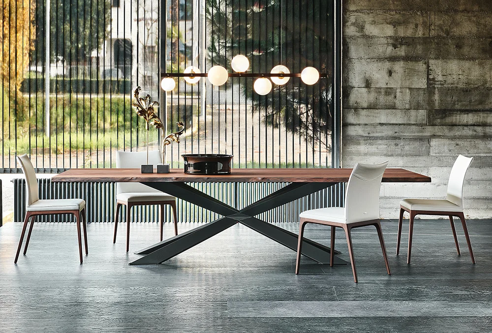 Descubre la mesa Spyder, un modelo de diseño excepcional que combina elegancia y materiales de alta calidad para transformar tu salón en un espacio sofisticado. Su base de acero en forma de X, con acabados brillantes que capturan y reflejan la luz, resalta la belleza del sobre.