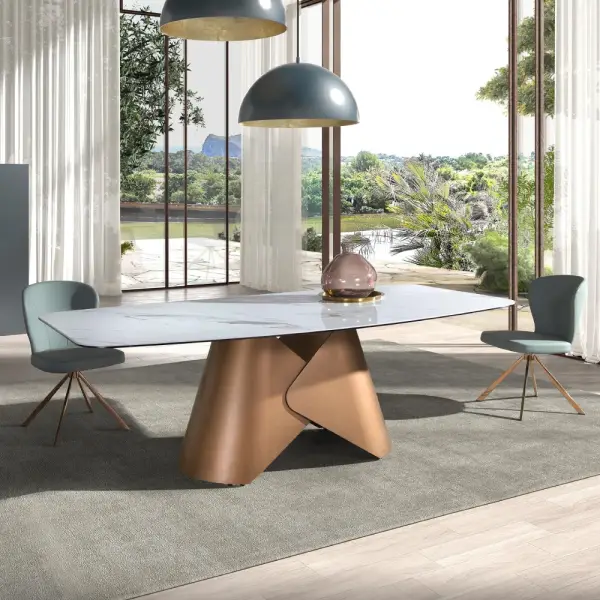 Sus patas de acero inoxidable en color bronce destacan como elemento clave del diseño, aportando estabilidad, estilo contemporáneo y un acabado premium. Una mesa perfecta para comedores modernos que buscan funcionalidad y diseño exclusivo.