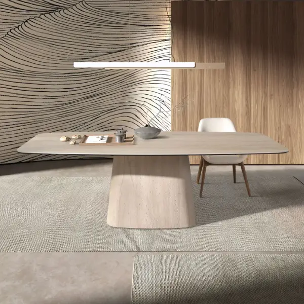 Sus originales patas de madera revestidas con lámina de mármol porcelánico flexible en color arena destacan como elemento clave del diseño, aportando continuidad visual, elegancia y un acabado contemporáneo único. Una mesa ideal para comedores modernos que buscan funcionalidad y diseño exclusivo.