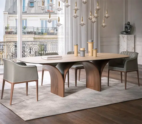 La mesa de comedor Arco destaca por su diseño elegante y atemporal, apoyado sobre patas curvas de madera que aportan ligereza visual y un equilibrio perfecto en cualquier estancia. Su silueta suave y armoniosa la convierte en una pieza versátil y decorativa, ideal para elevar el estilo de comedores modernos, espacios contemporáneos o interiores más clásicos con un toque sofisticado.