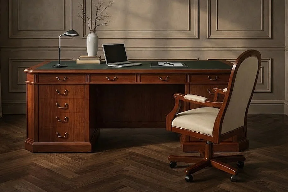 Este modelo destaca por su cuidada estética, sus líneas refinadas y la calidad de sus acabados, convirtiéndose en una pieza protagonista dentro del mobiliario de oficina. Además, puede personalizarse en diferentes colores de acabado, permitiendo adaptar esta mesa de oficina clásica de madera a distintos gustos y estilos decorativos.