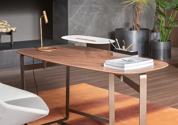 El escritorio Gauss se caracteriza por la fluidez y la armonía de las líneas: el tablero curvilíneo es suave y sin esquinas, así como las patas que lo sostienen, constituidas por anillos de metal con esquinas redondeadas.El estante crea un segundo nivel para el mueble: además del tablero principal de madera, el escritorio