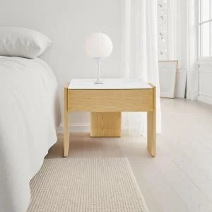 La mesita de noche Giovanni de 60,5 x 38 x 45,5 cm se caracteriza por su estilo moderno y el uso de materiales de alta calidad. Su tapa de porcelánico blanco aporta un acabado refinado, fácil de limpiar y resistente a arañazos, mientras que la estructura de roble ofrece calidez, solidez y un toque natural que se integra en cualquier dormitorio o salón contemporáneo.