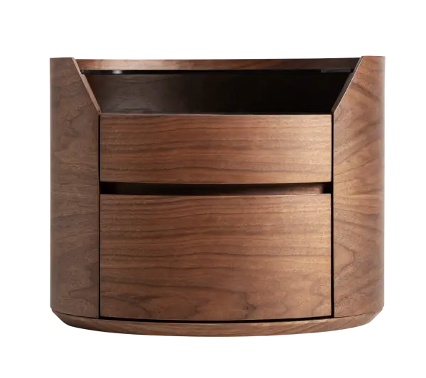 Esta mesita de noche marrón combina madera natural, cristal transparente y cerámica blanca para dar vida a una pieza de diseño moderno y sofisticado. Su estructura redondeada suaviza el espacio, mientras que sus líneas limpias y materiales nobles aportan una presencia cálida y contemporánea.