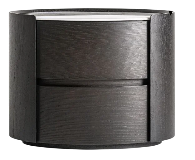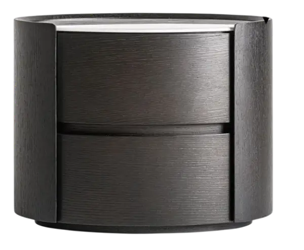 La mesita de noche Zofingen es una pieza de diseño contemporáneo con forma ovalada que destaca por su presencia elegante y equilibrada. Está fabricada en madera negra con una textura visible que aporta profundidad, mientras que su sobre de piedra sinterizada blanca crea un contraste refinado y moderno. Incorpora dos cajones de apertura frontal curva que siguen la línea envolvente del diseño, ofreciendo almacenamiento práctico sin romper la armonía visual. Sus dimensiones 60 cm de ancho, 41 cm de fondo y 48 cm de alto, la convierten en una opción perfecta para añadir sofisticación y funcionalidad a cualquier dormitorio.