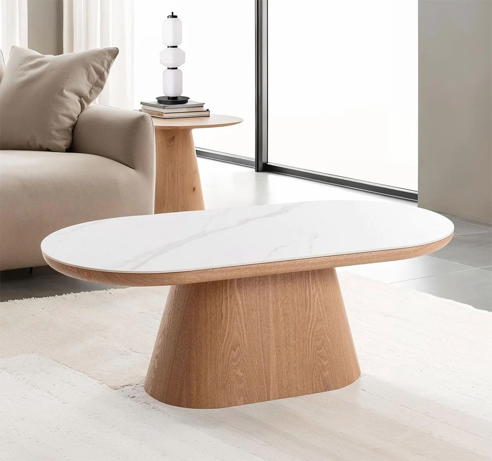 Perfecta para situarse frente al sofá, proporciona espacio funcional para colocar bandejas, libros, objetos decorativos o bebidas. Su diseño de líneas suaves pero firmes otorga carácter y sofisticación, adaptándose con facilidad a salones o comedores de estilo moderno. La combinación de porcelánico y madera garantiza una mesa duradera, práctica y con un acabado distinguido que se integra armónicamente en diferentes ambientes decorativos.