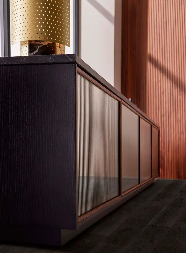 Los deslumbrantes aparadores de la colección Rio comparten una característica única: todos reposan sobre elegantes cilindros de mármol macizo. Esta elección no solo aporta una sensación de solidez, sino que también confiere majestuosidad en contraste con la delicadeza de los cuidadosamente elaborados armarios superiores. Los marcos de madera de líneas esbeltas y las puertas de apertura rápida, enriquecidas con incrustaciones de madera estructurada, actúan como un enlace elegante entre los dos elementos principales. Este cautivador diálogo entre todos los componentes culmina en una sofisticación inigualable que define el carácter distintivo de la colección.