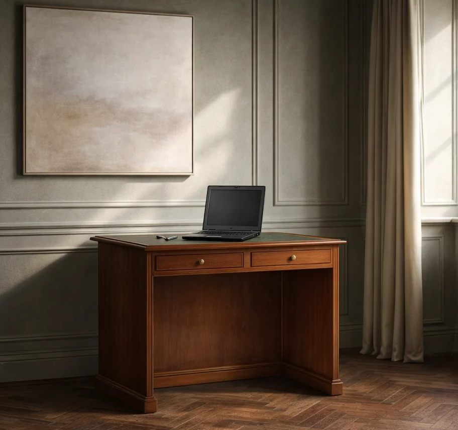 Esta refinada mesa de escritorio clásica con 2 cajones es la opción ideal para espacios de trabajo compactos que no quieren renunciar al encanto del mobiliario tradicional. Fabricada en chapa natural de cerezo, ofrece un acabado cálido y elegante que eleva la estética de cualquier despacho o zona de estudio.