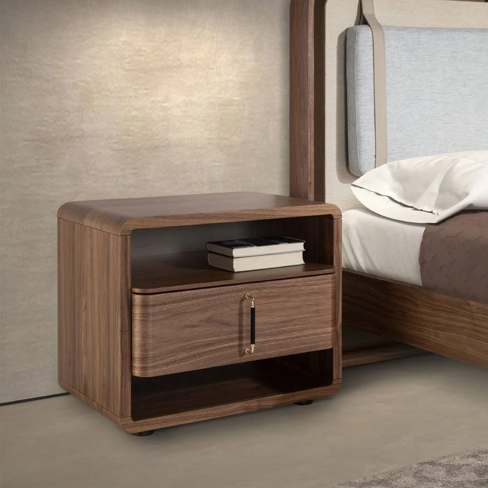 Mesita de noche de diseño moderno fabricada en madera chapada en nogal natural, ideal para dormitorios elegantes y contemporáneos. Incorpora patas originales de PVC en color negro que aportan un contraste moderno y sofisticado. Dispone de un práctico cajón con sistema de apertura mediante tirador de lengüeta y cierre soft-closing, ofreciendo un uso cómodo, silencioso y funcional. Esta mesita de noche de diseño combina estilo, calidad y funcionalidad, proporcionando un amplio espacio de almacenaje perfecto para organizar objetos personales en el dormitorio.