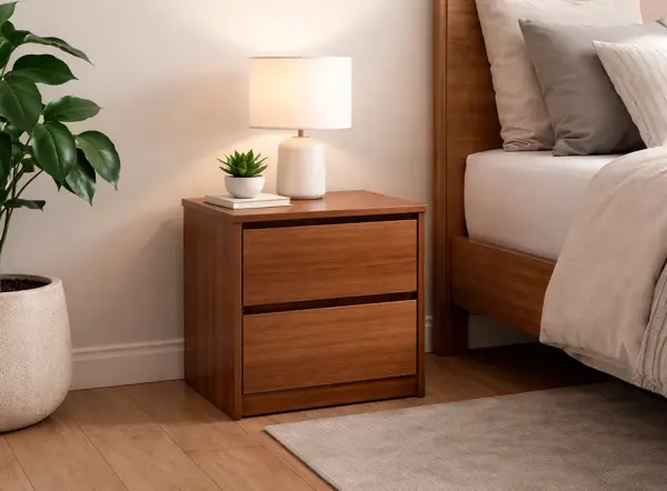 Esta mesa de noche de 2 cajones con cajón secreto combina diseño, funcionalidad y un extra de seguridad, convirtiéndose en una pieza ideal para dormitorios contemporáneos y proyectos de interiorismo cuidados al detalle.