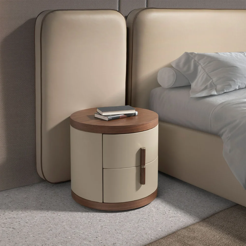 Mesita de noche moderna en nogal natural con 2 cajones y detalles dorados