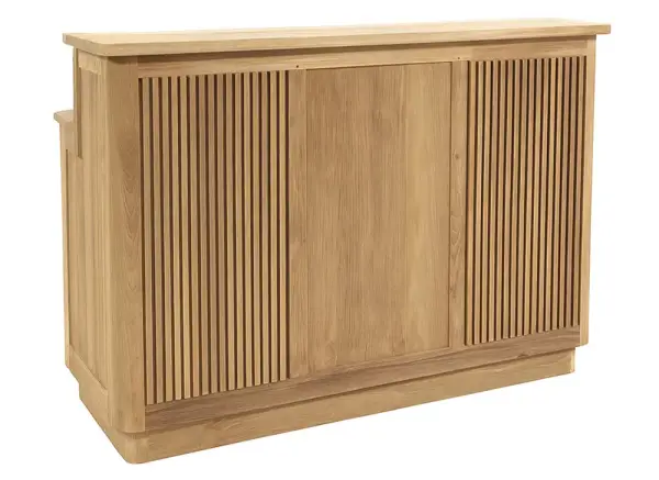 Mostrador o mesa de escritorio en madera de teca natural, modelo Eyre. Su diseño versátil y sobrio encaja tanto en espacios de trabajo como en zonas de atención al cliente. La teca aporta resistencia y una belleza atemporal. Una pieza funcional con carácter y presencia propia.