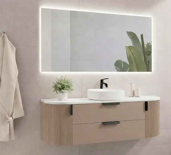 El mueble de baño curvo lacado con lavabo y grifo Flute destaca por su diseño contemporáneo y equilibrado, donde las líneas suaves y los laterales acanalados aportan textura y elegancia al conjunto. Su formato suspendido no solo aligera visualmente el espacio, sino que también facilita la limpieza diaria, convirtiéndolo en una opción práctica para el día a día. El acabado en tono beige aporta calidez y versatilidad, adaptándose fácilmente a distintos estilos de baño, desde los más minimalistas hasta ambientes más naturales. La encimera blanca en contraste y el lavabo de líneas redondeadas refuerzan su estética moderna, mientras que los cajones amplios ofrecen una solución funcional para mantener el orden sin renunciar al diseño.