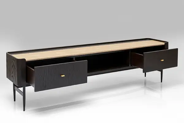El mueble de tv moderno roble Milano,está realizado en chapa natural de roble color nogal y tapa efecto textil. Esta pieza de gran diseño italiano, dará ese toque elegante estilo a tu instancia, con estas líneas de proporción artesanal Italiana.