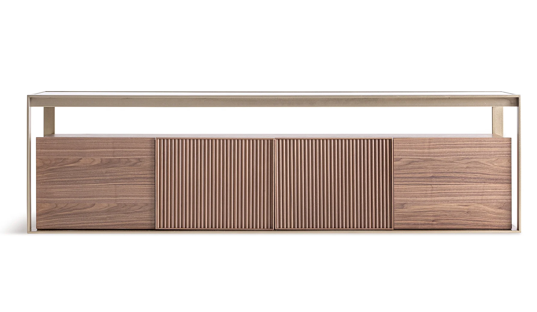 El mueble de TV Aisby es una pieza de estilo contemporáneo que combina fresno claro, cristal templado y detalles en acero champagne para lograr un diseño elegante y luminoso. Su estructura superior metálica en acabado champagne sostiene una superficie de cristal que aporta ligereza visual, mientras que el cuerpo de madera ofrece calidez y equilibrio. Cuenta con cuatro puertas abatibles, dos lisas y dos con un atractivo relieve estriado, que se abren hacia afuera para dar acceso a tres amplios compartimentos interiores ideales para guardar dispositivos, cables u objetos decorativos. Sus líneas rectas y materiales contrastados le dan un aspecto moderno y refinado. El mueble mide 200 cm de ancho, 45 cm de fondo y 58 cm de alto, lo que lo convierte en una pieza amplia y funcional para cualquier salón.