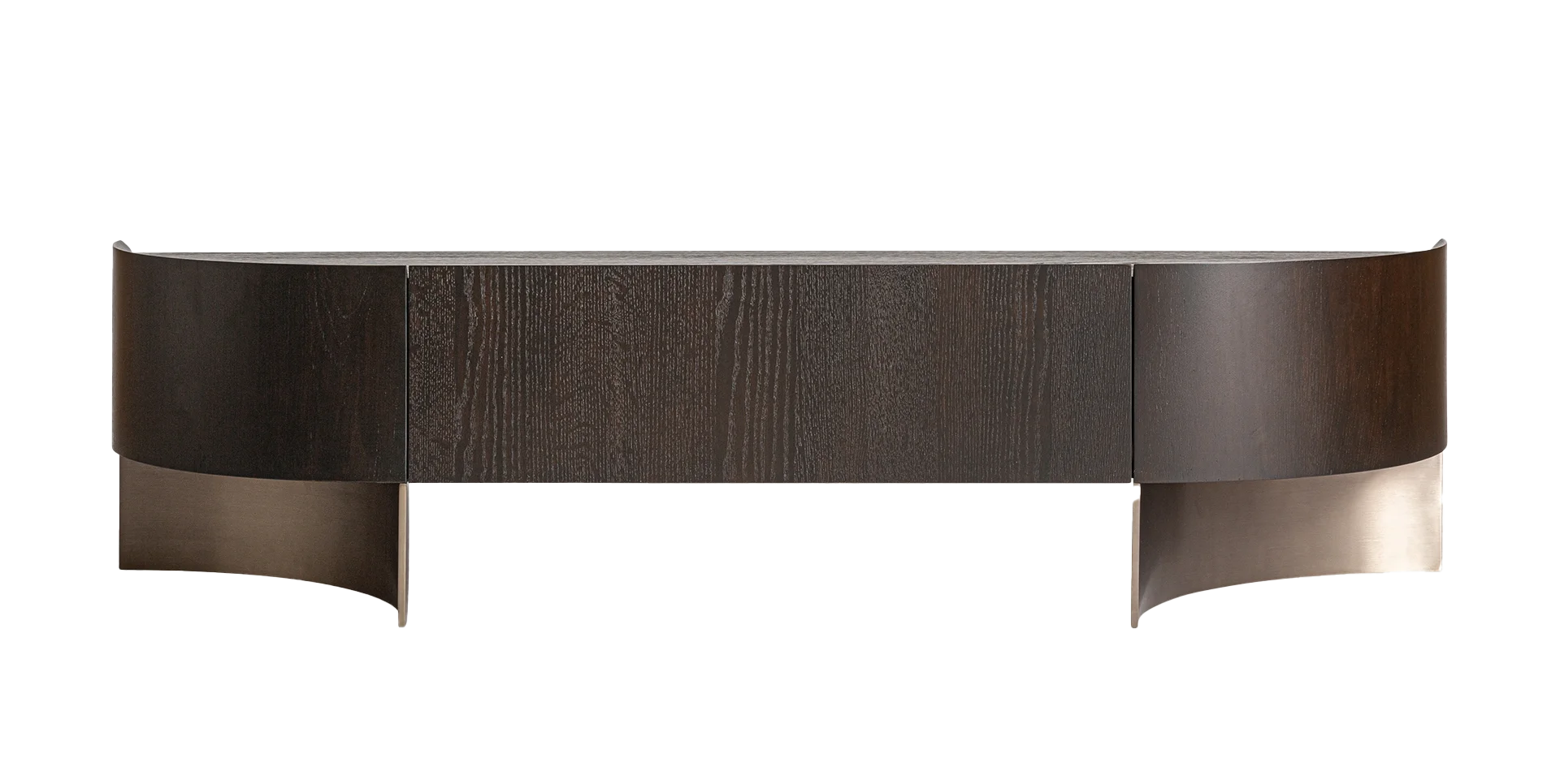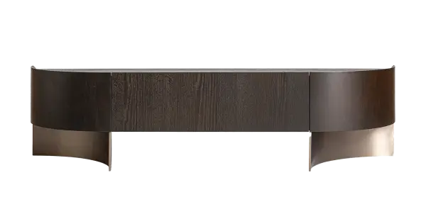 La estructura del Neuvic está fabricada en chapa de roble oscuro, que aporta una calidez natural y un toque cómodo. Este acabado en madera genera una atmósfera acogedora, perfecta para integrar en tu sala de estar o área de entretenimiento. La combinación con el acero dorado en la base le confiere un aire moderno y lujoso, contrastando con la calidez del roble y creando un hermoso juego de texturas.