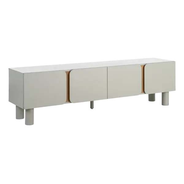 El mueble cuenta con cuatro puertas, cada una de ellas con dimensiones de 43 x 33,5 cm. Estas puertas son perfectas para ocultar los cables y otros objetos, manteniendo un aspecto ordenado y organizado. El diseño de las puertas, con formas redondeadas, agrega un toque contemporáneo y distintivo al mueble, haciéndolo visualmente atractivo.
