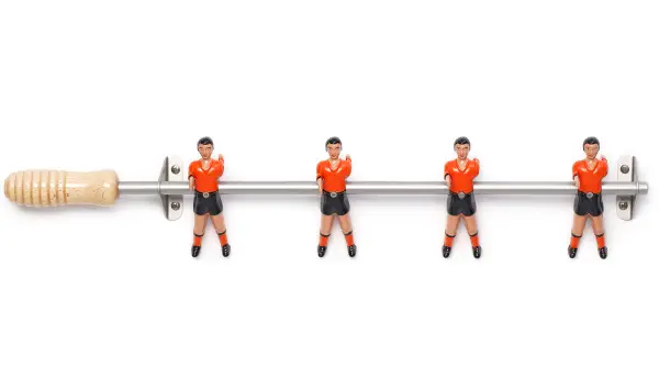 Los jugadores del clásico futbolín dan un salto y se presentan en un colgador de pared.