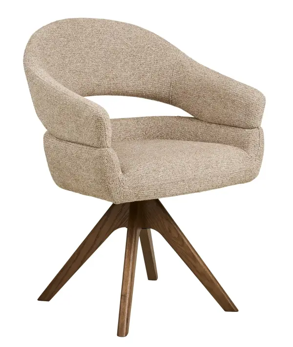 La silla de comedor Dover giratoria es una pieza de diseño contemporáneo que combina confort, funcionalidad y estética cálida gracias a su tapizado en tejido poliéster efecto heathered en tono sand y su base de madera de roble marrón. Su diseño envolvente con respaldo curvo y asiento acolchado proporciona una sentada ergonómica y cómoda, ideal para comedores elegantes y espacios de interiorismo actual.