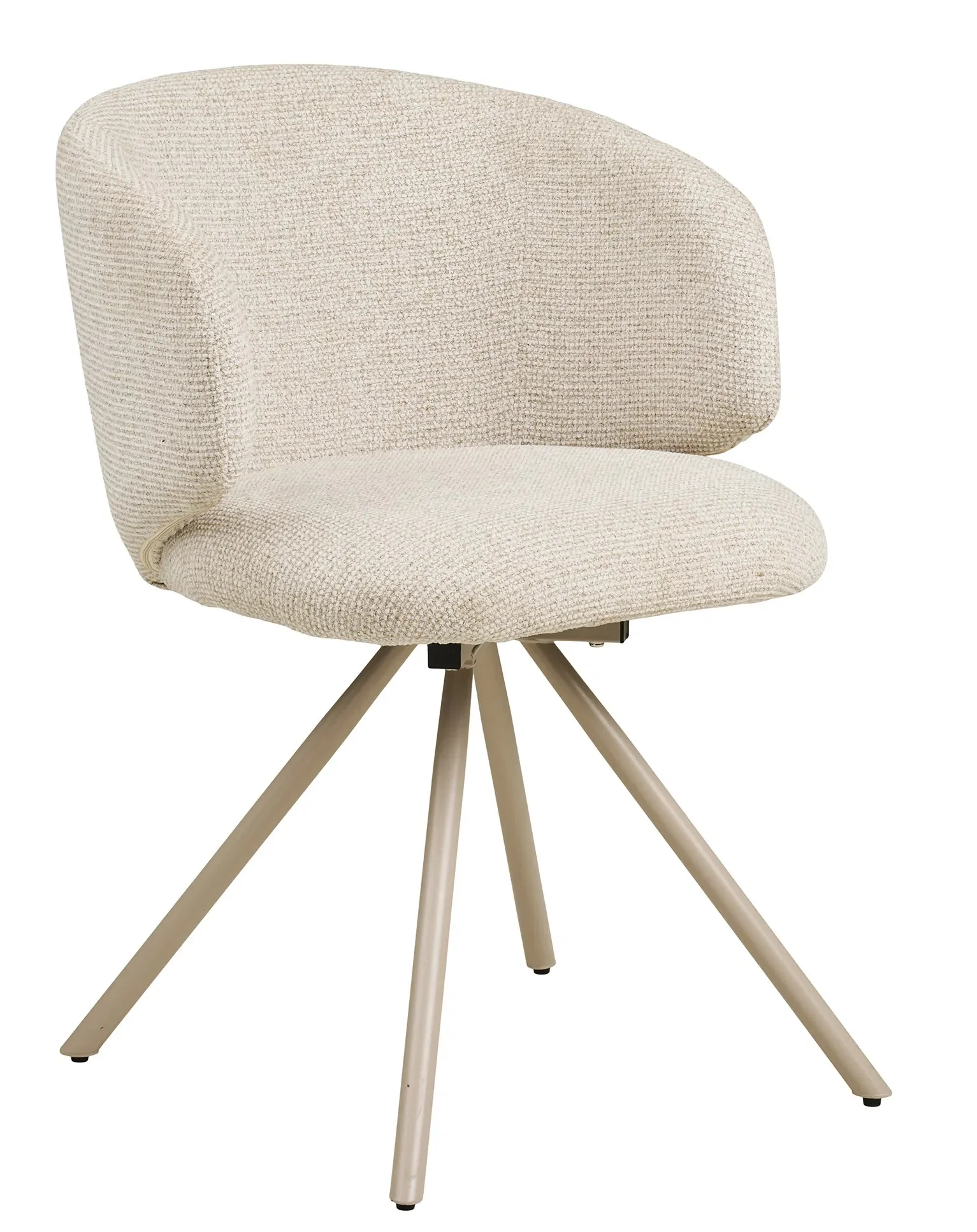 Tapizada en tejido de poliéster con textura suave, esta silla ofrece una estética neutra y versátil que encaja fácilmente con mesas de madera clara, porcelánico o acabados en roble, especialmente si buscas composiciones equilibradas y luminosas. La base metálica en color arena con sistema giratorio aporta estabilidad, durabilidad y mayor practicidad en el uso diario.