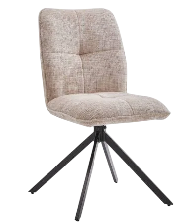 El asiento y respaldo están tapizados en una suave tela color beige que aporta calidez y elegancia al entorno. La textura del tejido no solo es agradable al tacto, sino que también ofrece un aspecto visual interesante, haciendo que la silla se destaque sin ser excesivamente llamativa.