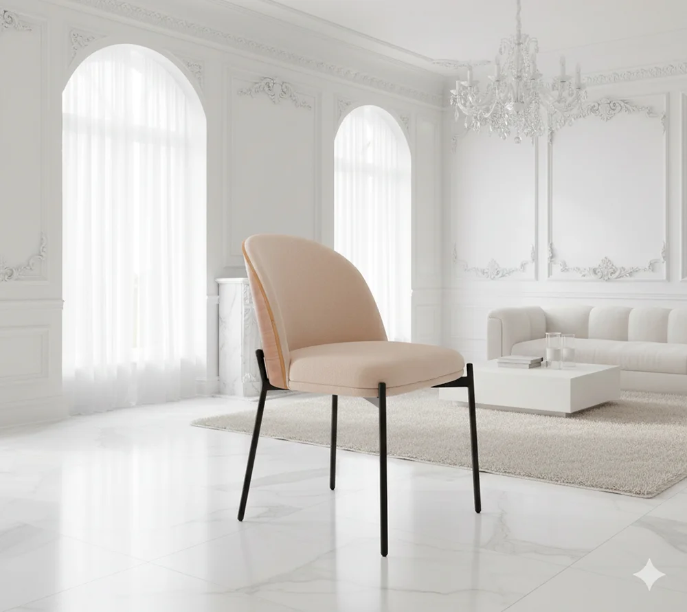 Silla Ingrid diseñada con un elegante asiento en chapa de nogal curvado, tapizado en beige con tejido Aquaclean de fácil limpieza. Su estructura se completa con patas metálicas en color negro, que aportan resistencia y un estilo contemporáneo. Una pieza versátil y sofisticada, ideal para comedores, salones o espacios de diseño moderno.