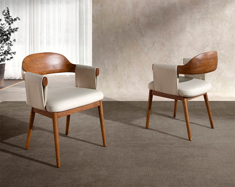 Incorpora estilo y confort a tu espacio con esta silla con reposabrazos de diseño moderno de la firma Angel Cerdá. Su estructura combina un respaldo curvado en madera de color nogal con un asiento tapizado en polipiel color crema, ofreciendo un contraste elegante y actual. Las patas de madera en acabado nogal natural, de estilo vanguardista pero atemporal, aportan estabilidad y sofisticación, convirtiéndola en una pieza clave tanto para el comedor como para la cocina. Esta silla representa el equilibrio perfecto entre diseño exclusivo, comodidad y durabilidad, fiel al sello distintivo de Angel Cerdá.