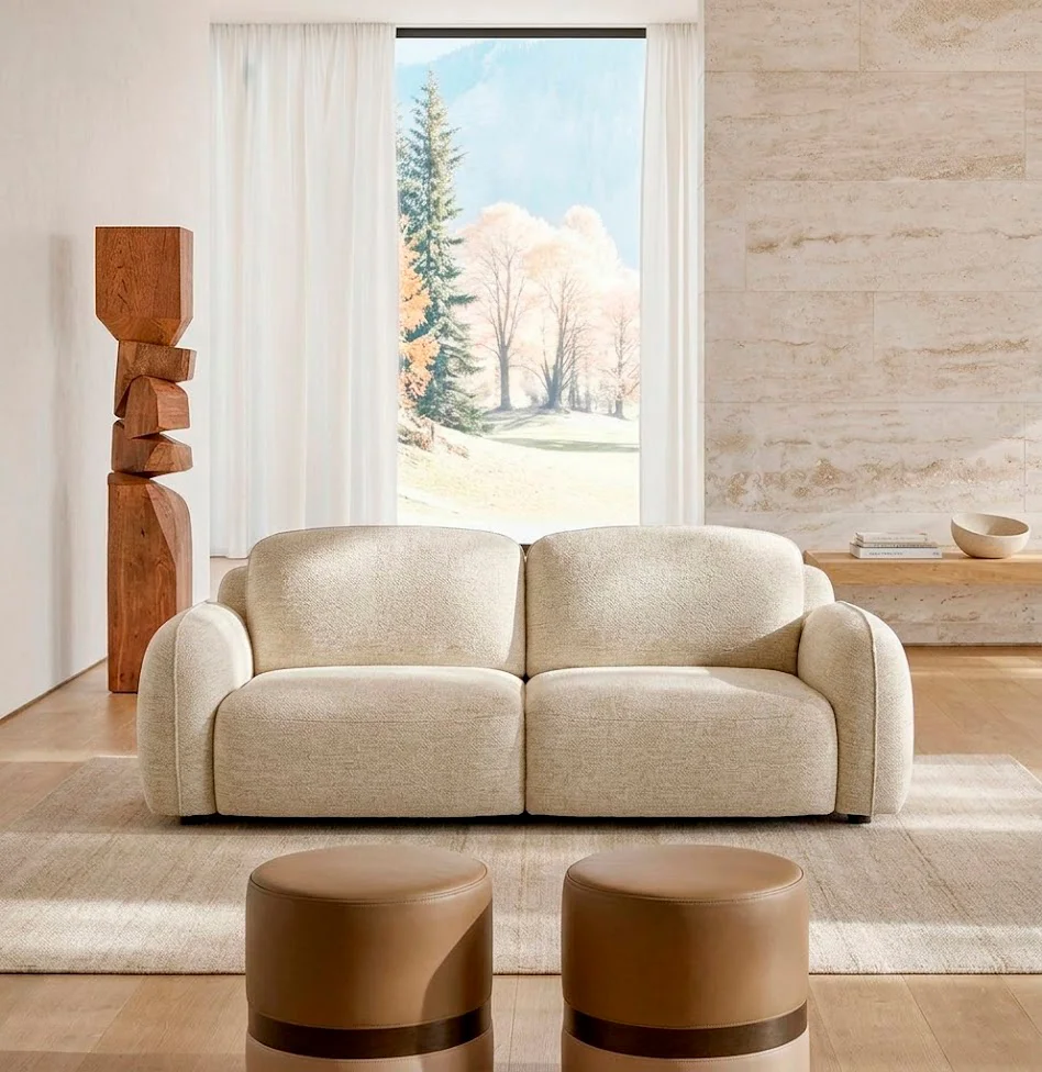 El relleno del respaldo está fabricado en espuma de poliuretano indeformable de densidad 25 kg/m³ revestida en Tecnoform, y el asiento combina espuma de poliuretano indeformable de 30 kg/m³ con memory foam, proporcionando una sentada cómoda, envolvente y de alta recuperación. Disponible en tejido o textil completamente desenfundable (según etiqueta de composición y lavado), este sofá no está disponible en piel y permite acabado bicolor (estructura y cojines) con un incremento del 10% en la categoría de revestimiento superior.