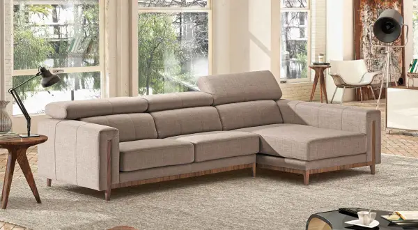 Este sofá con chaise longue está realizado en chapa natural de nogal tanto en las patas, base y frentes de los brazos. Tiene el cabezal abatible, un hecho que le confiere versatilidad, ya que permite recostar la cabeza en caso deseado o tener bajado para una estética más elegante.