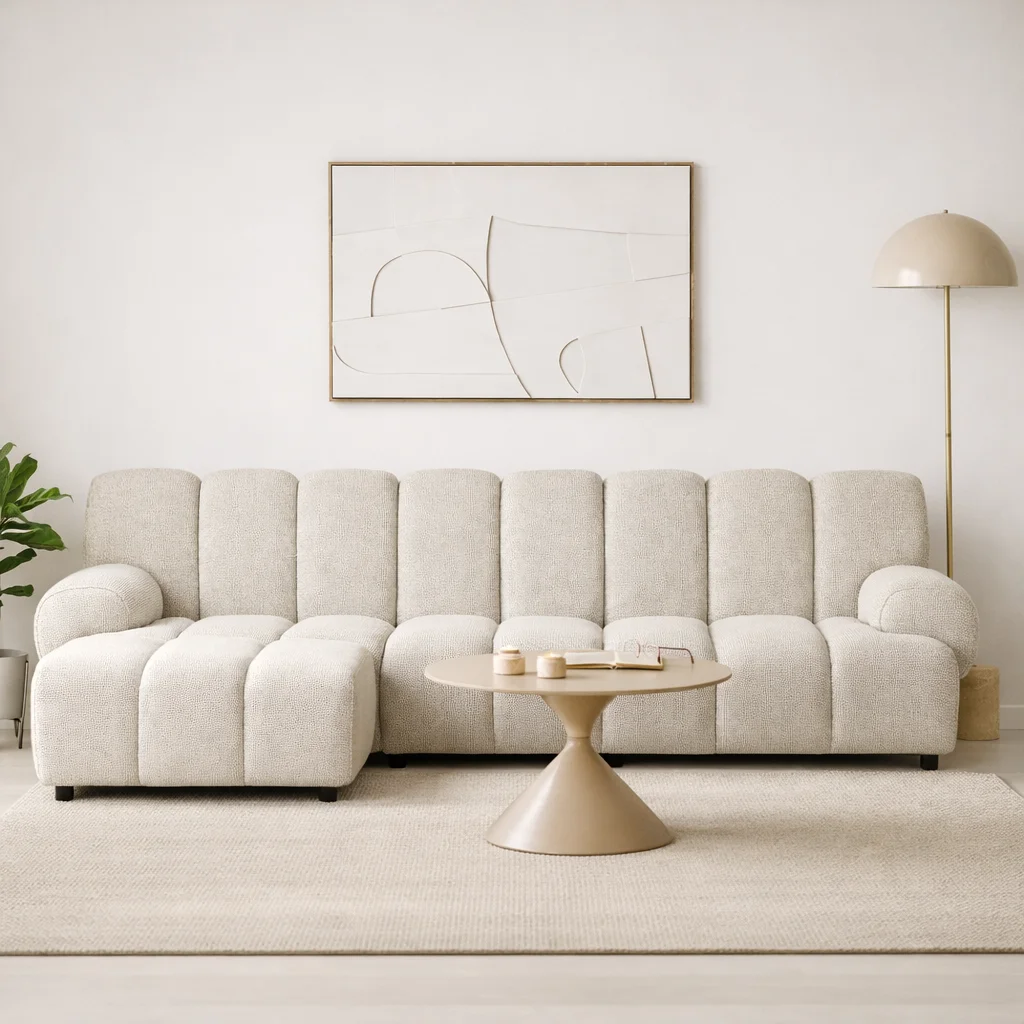 El sofá modular de 3,5 plazas con pouf en color sand es una pieza de diseño contemporáneo pensada para crear salones acogedores, elegantes y de alto confort. Su estética de líneas redondeadas y volumen generoso, combinada con un tapizado en poliéster 100% de tacto suave, lo convierte en un sofá protagonista ideal para interiores modernos y cálidos, especialmente en composiciones con maderas claras y tonos neutros.