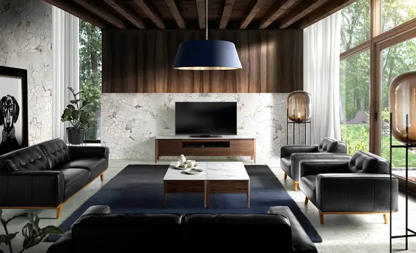 El sofá moderno nogal y piel Civetta, está realizado con una estructura de pino, tapizado en piel de vacuno color negro. tapas de madera de nogal