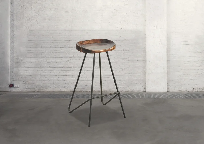 Taburete industrial realizada en metal con asiento de madera de pino reciclado.