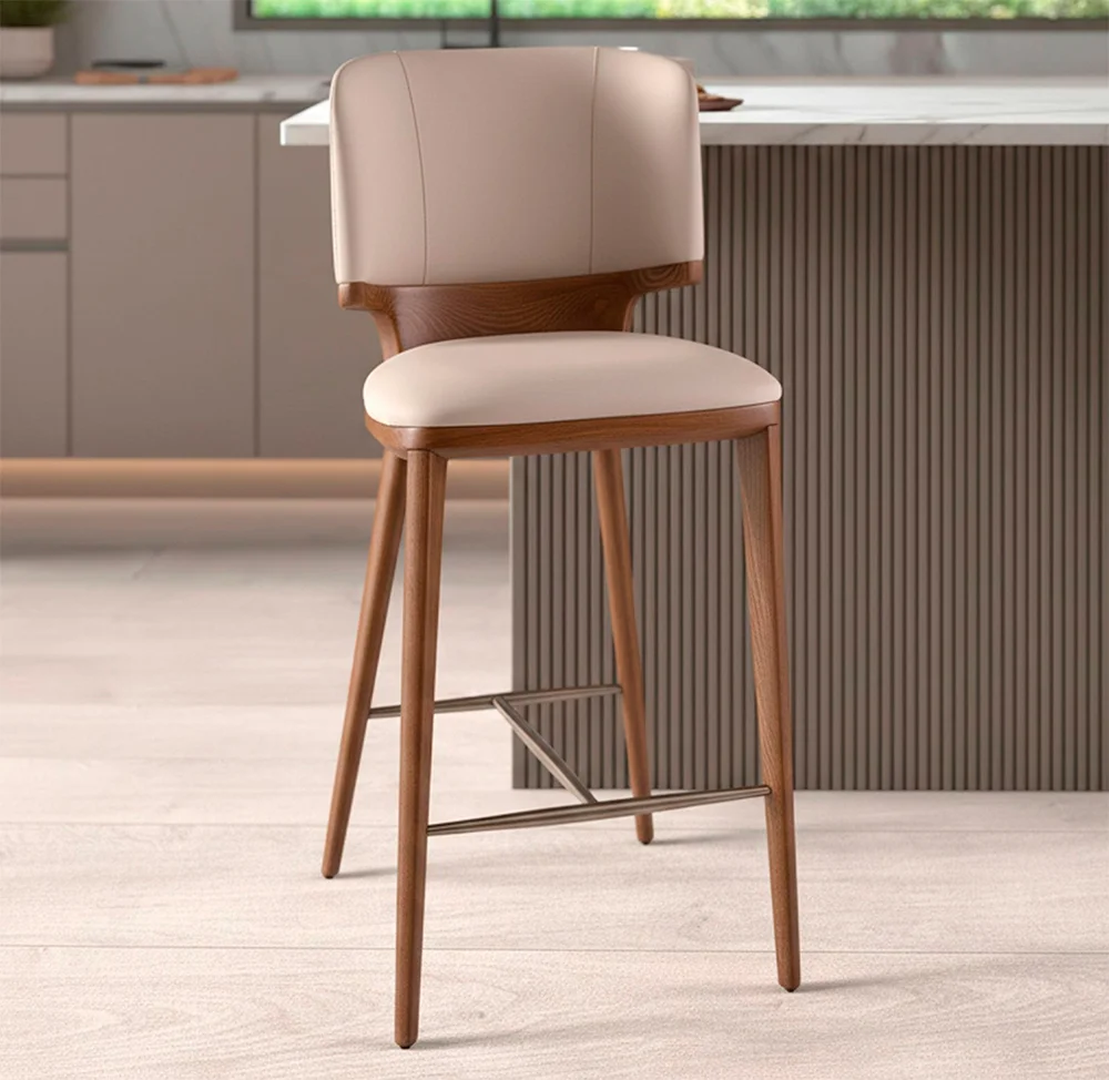 Taburete moderno en polipiel crema con patas de nogal y detalle dorado