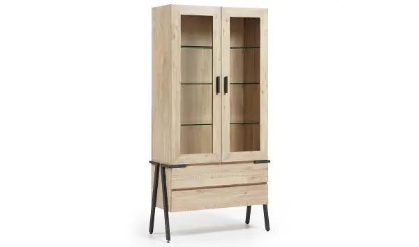 Vitrina en madera de acacia maciza en acabado natural blanqueado. Pies en metal pintado envejecido
