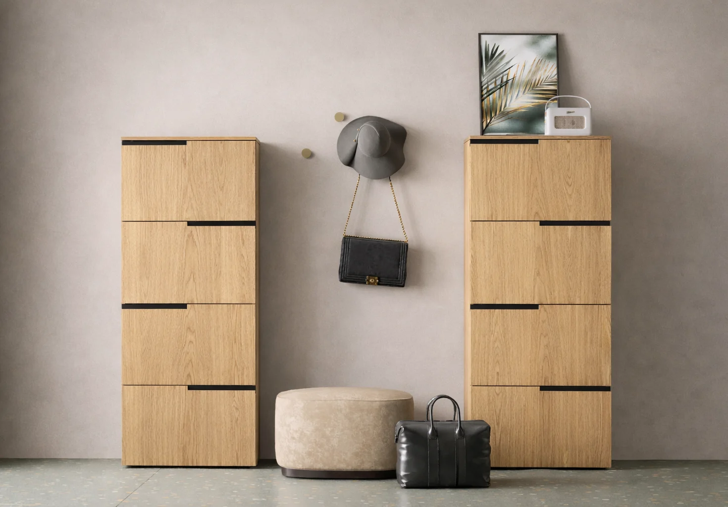 Zapatero de entrada de líneas limpias y esenciales, pensado para quienes buscan un mueble funcional y a la vez elegante. Con 4 gabetas y acabado en chapa natural de roble natural, aporta calidez y un look sofisticado que encaja en recibidores modernos y contemporáneos. Su sistema de modularidad avanzada permite adaptarlo a cada hogar gracias a 3 anchuras y 3 profundidades diferentes, logrando el ajuste perfecto según el espacio y las necesidades de cada persona. El formato vertical optimiza metros sin recargar visualmente, mientras que las gabetas facilitan una organización cómoda del calzado y accesorios. Un zapatero personalizable, versátil y diseñado para mantener el orden con estilo desde el primer paso al entrar.