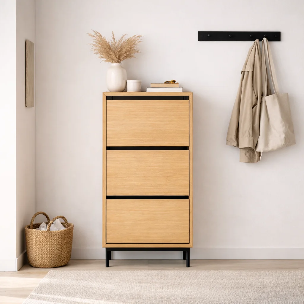 El zapatero cuenta con tres compartimentos abatibles, cada uno con un sistema interior metálico que permite organizar varios pares de zapatos de forma accesible y ventilada. Cada cajón mide 56 × 33 cm, ofreciendo un buen espacio para calzado del día a día.