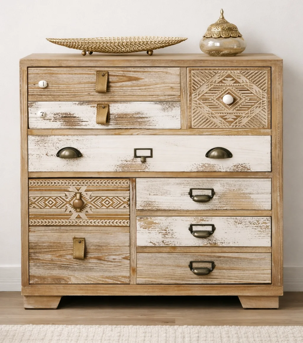 Este zapatero de madera de abeto en acabado natural combina calidez y personalidad con un diseño artesanal de aire boho, ideal para mantener el calzado ordenado con estilo. Sus frentes combinados con detalles tallados y efecto decapado aportan textura y un carácter único, encajando fácilmente en recibidores, pasillos o dormitorios. Con unas medidas de 80 × 25 × 82 cm, ofrece una solución de almacenaje compacta, perfecta para espacios estrechos sin renunciar a capacidad. La estructura en abeto aporta ligereza visual y una estética orgánica muy fácil de integrar en estilos nórdicos, mediterráneos o rústico contemporáneo. Es una pieza funcional y decorativa a la vez, pensada para el uso diario y para dar personalidad a la entrada de casa. Medidas de embalaje/cubicaje: 86 × 30 × 87 cm y peso 20,73 kg.